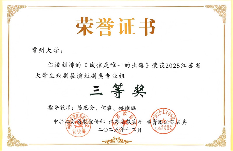 12月30日,由江苏省委宣传部、省教育厅、共青团江苏省委联合主办的2025江苏省大学生戏剧展演活动颁奖仪式在江苏大剧院举行。我校赵元任音乐与戏剧学院选送的作品在本届展演中斩获佳绩:原创短剧《闪耀的青春》荣获短剧类(专业组)一等奖,短剧《诚信是唯一的出路》荣获短剧类(专业组)三等奖。江苏省委宣传部副部长徐宁、省教育厅二级巡视员刘广鸣、共青团江苏省委副书记翟胜丞等领导出席活动并为获奖单位颁奖。我校党委常委、副校长杨琳应邀出席,赵元任音乐与戏剧学院相关负责人员陪同参加。