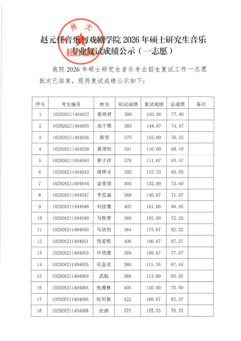 赵元任音乐与戏剧学院2026年硕士研究生音乐专业复试成绩公示(一志愿)