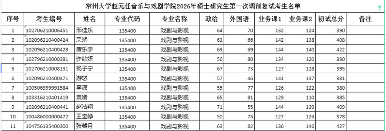 赵元任音乐与戏剧学院2026年硕士研究生第一次调剂复试考生名单