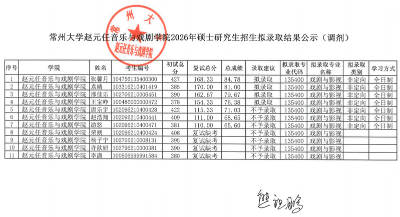 赵元任音乐与戏剧学院2026年硕士研究生招生拟录取结果公示(调剂)